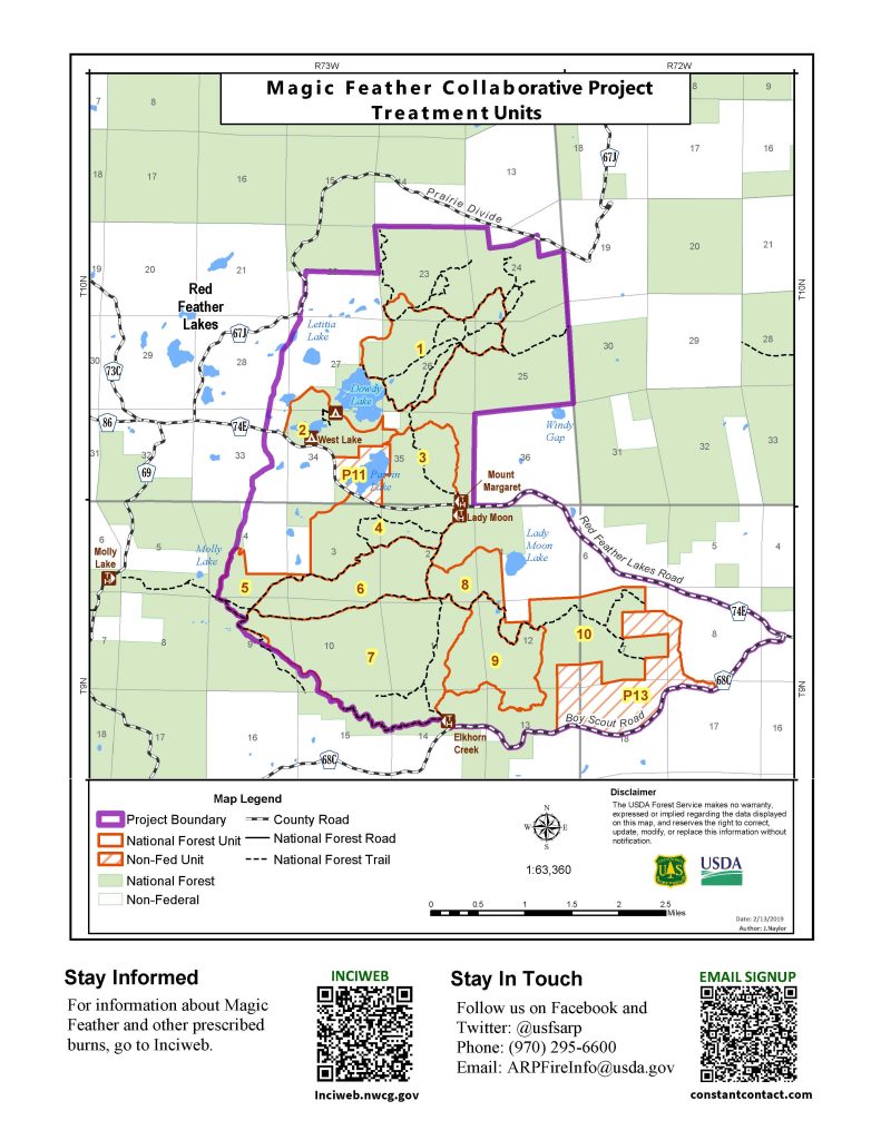 The Canyon Lakes Ranger District of the Arapaho and Roosevelt National Forests, in cooperation with the Natural Resources Conservation Service (NRCS), The Nature Conservancy (TNC), and Coalition for the Poudre River Watershed (CPRW), is proposing to broadcast burn on both National Forest System (NFS) lands and non-NFS lands. The Magic Feather Collaborative Project area is generally located east of Red Feather Lakes, Colorado and the project area generally consists of ponderosa pine, aspen, riparian areas, and mixed conifer stands. The goal of this project is to restore the ponderosa pine and mixed conifer stands to a more natural state, including reducing surface and crown fuel loading across the landscape, retaining and encouraging old-growth qualities, and improving wildlife habitat.